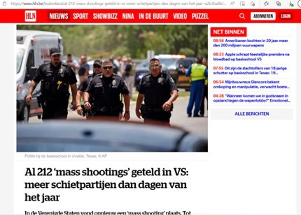 Per jaar vallen er 35-40.000 doden en zijn er tegen de 700 'mass-shooting' (incidenten met 3-4 doden). In 2022 telden de eerste vijf maanden al 250 van dergelijke indicidenten. - Vuurwapengeweld vormt de voornaamste doodsoorzaak onder kinderen en tieners in de VS in 2020