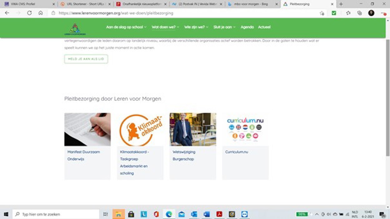 MBO voor morgen is weer onderdeel van Leren voor Morgen. Dé coöperatie voor duurzaamheid in het hele onderwijs, van peuter tot postdoc. Dankzij deze organisatie is duurzaamheid nu het grootste aandachtspunt m.b.t. curriculum.nu in het VO. Al 150 organisaties zijn aangesloten. De voorzitter Giuseppe van de Helm is de kartrekker van SDG 4 (onderwijs). Het veld is dus enorm in beweging maar het is allemaal los vast, goed bedoeld, uitgaande van veel gedrevenheid, maar met weinig ondersteuning van professionals.