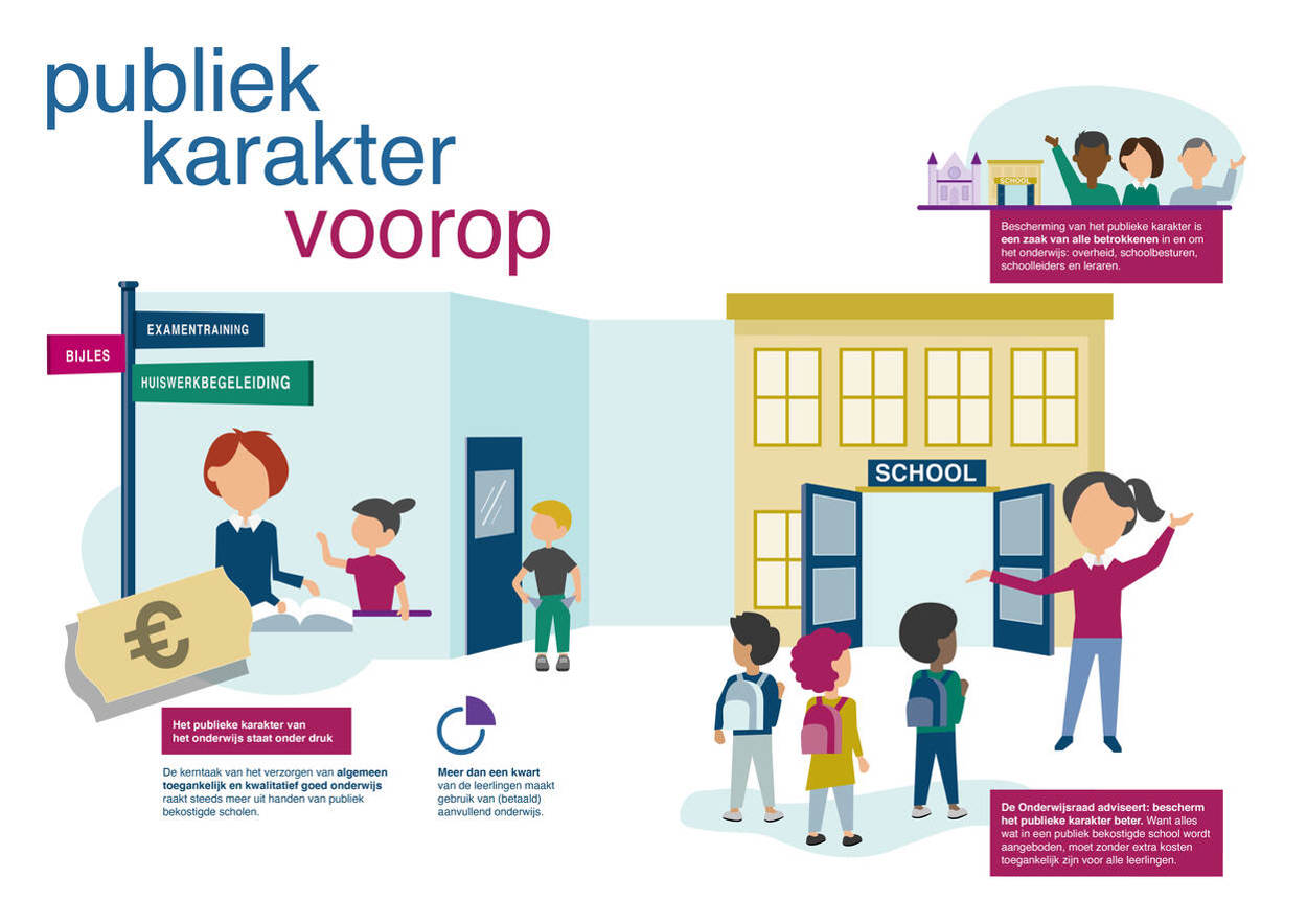 Overheid, schoolbesturen en scholen moeten het publieke karakter van het onderwijs beter beschermen, adviseert de Onderwijsraad. De raad constateert dat het private onderwijsaanbod niet alleen fors toeneemt, maar dat publiek en privaat onderwijs ook steeds meer verstrengeld raken. Dit heeft als risico dat het onderwijs op door de overheid bekostigde scholen niet meer zonder financiële drempels voor alle leerlingen toegankelijk is. Daarnaast verschraalt de onderwijskwaliteit en hebben leraren en schoolleiders minder zeggenschap over het onderwijs op hun school.