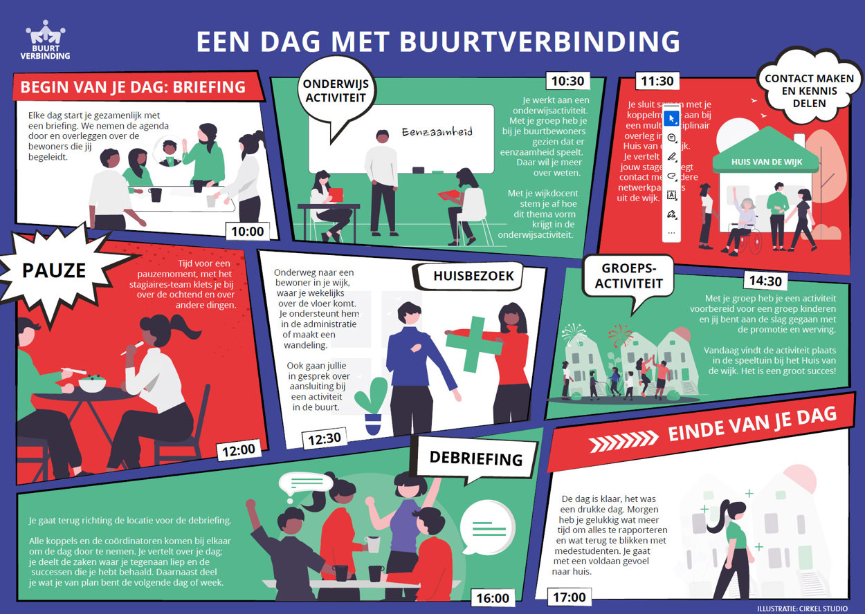 Bij Buurtverbinding werken de studenten aan laagdrempelige hulpvragen van buurtbewoners. Een voorbeeld van een laagdrempelige hulpvraag is een huisbezoek met praktische hulp bij het boodschappen doen. Zij geven niet alleen individuele aandacht aan wijkbewoners. De studenten organiseren ook activiteiten voor de wijk. Zo dragen ze bij aan het welzijn van de buurtbewoners op vijf verschillende locaties in Amsterdam.