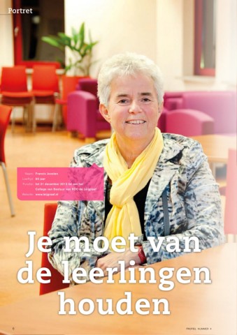 Portret Naam: Francis Joosten Leeftijd: 65 jaar Functie: tot 31 december 2013 lid van het College van Bestuur van ROC de Leijgraaf Website: www.leijgraaf.nl Je moet van de leerlingen houden 6 PROFIEL NUMMER 4