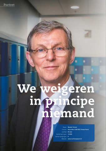 Portret We weigeren in principe niemand Naam: Sjouke Tuinier Functie: Voorzitter CvB ROC Friese Poort Leeftijd: 62 jaar Aantal leerlingen: 13.500 Aantal vestigingen: 5 Website: www.rocfriesepoort.nl 10 PROFIEL NUMMER 8