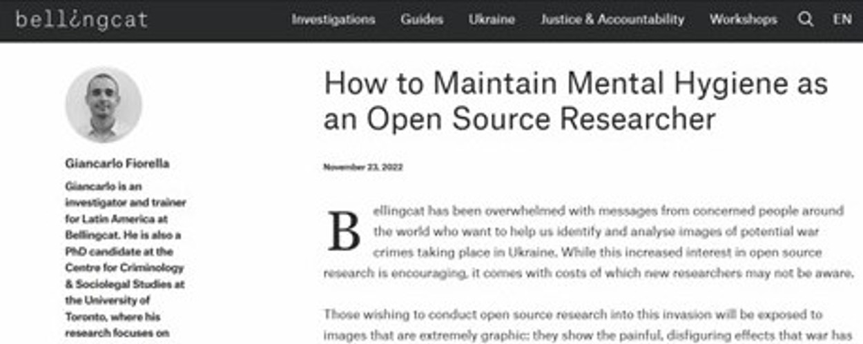 Bellingcat maakt zich zorgen over het effect op het individu van de overdaad van berichten op social media en internet met een (zeer) gewelddadig karakter. Bellingcat is een internationaal burger-onderzoeksjournalistieknetwerk dat staat ingeschreven als stichting in Nederland. Het netwerk is gespecialiseerd in factchecken en het uitvoeren van Open Source Intelligence (OSINT). Het maakt daarbij onder andere gebruik van online bronnen, zoals sociale media en open data. Het onderzoekt internationale conflicten en werd bekend door berichtgeving over de Syrische Burgeroorlog, de oorlog in Oost-Oekraïne, de vliegramp met de MH17, de vergiftiging van Sergej en Joelia Skripal en later van Aleksej Navalny. Bellingcat is zich bewust van het effect van beelden met een gewelddadig arakter en geeft advies hoe daarmee om te gaan. Het stelt: ‘Those wishing to conduct open source research into this invasion will be exposed to images that are extremely graphic. They show the painful, disfiguring effects that war has on human bodies, cities and nature. Many of these images can be highly distressing, especially if viewed repeatedly and intensely. But their effect can also be cumulative: you may feel alright for a long time until one day, you don’t. Practicing good mental hygiene is a continuous process that requires active input at all times. The small steps you take today to minimise and mitigate your exposure to distressing content may in a few years’ time save you from burnout or worse.’