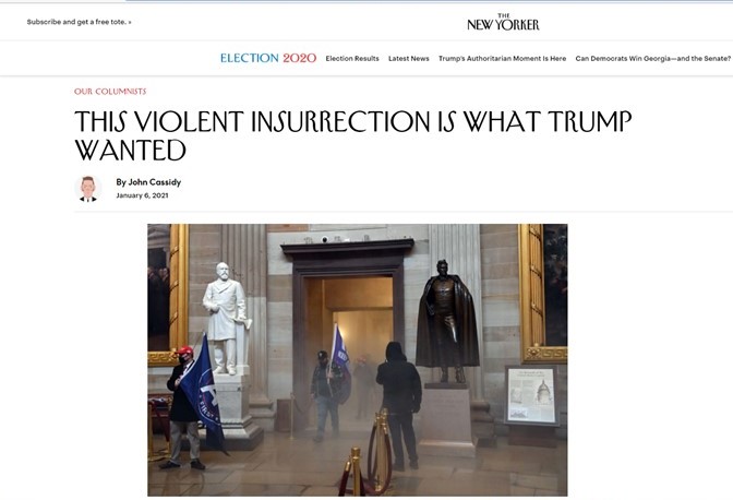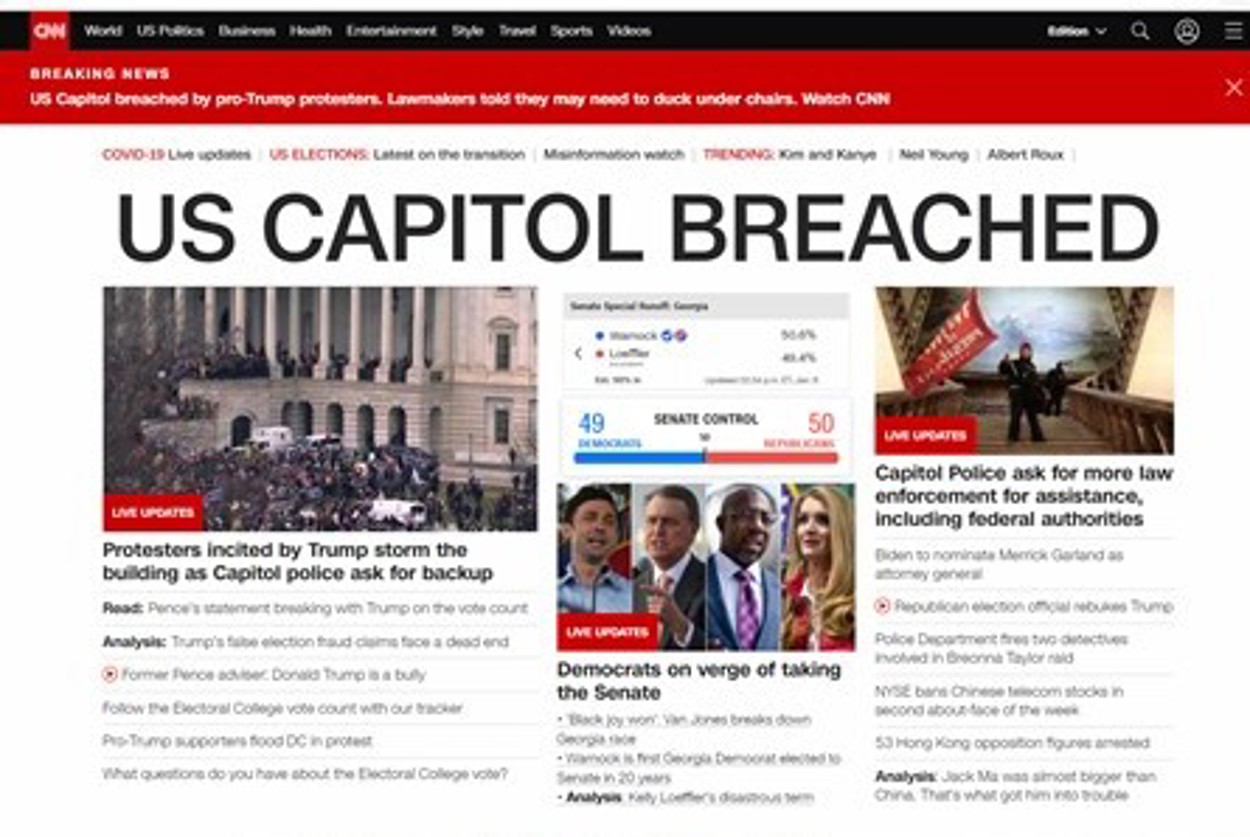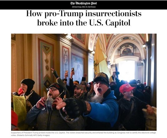 In de VS is 6 januari jl na de verkiezingsdag van 3 november een ceremoniële dag waarop het Congres de stemmen telt die de verkiezing van de toekomstige president en diens vice-President bevestigen. Al weken van tevoren had Trump zijn aanhangers opgeroepen naar Washington te komen. 'Going to be wild' twitterde hij. Het werd 'wild'. Duizenden omringden het Capitool waar op dat moment de telling van de stemmen plaatsvond en honderden drongen het Capitool binnen. Functionarissen van de geheime dienst kwamen de Senaat en het Lager Huis binnen en senatoren werden in allerijl geëvacueerd. Opstandelingen drongen kantoren en de Senaat en het Lager Huis binnen en maakten selfies en video's. Sinds 1812 had Washington een dergelijk beleg niet meer meegemaakt.