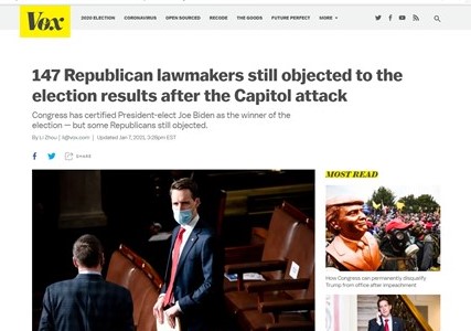 - Kort na de bestorming op 6 januari van het Capitool vervolgde het Congres het in de Constitutie vastgelegde proces om met het tellen van de stemmen de verkiezing van Joe Biden te bevestigen. Ondanks de revolte kort daarvoor van Trump-aanhangers stemden 147 Republikeinen tegen.