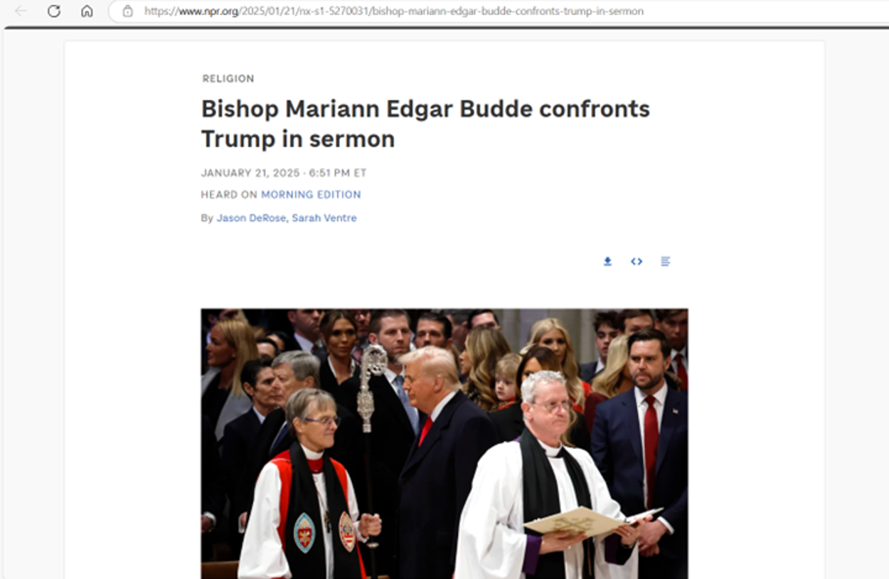 Wat de ‘corporate media’ en Donald Trumps eigen Republikeinen niet (meer) durven, hem in zijn gezicht confronteren met zijn hardvochtigheid jegens kwetsbaren in de samenleving, deed Marianne Edgar Budde, Episcopale bisschop van de Washington National Cathedral.